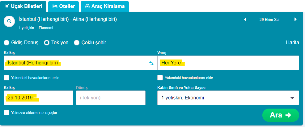 *Her yere en ucuz özelliği (favorimiz): Bu özelliğin yukarıdaki ekrandan tek farkı, tarihi de ucu açık bırakmanız. Yani, İstanbul’dan herhangi bir yere, herhangi bir tarihte en ucuz bileti görüyorsunuz.