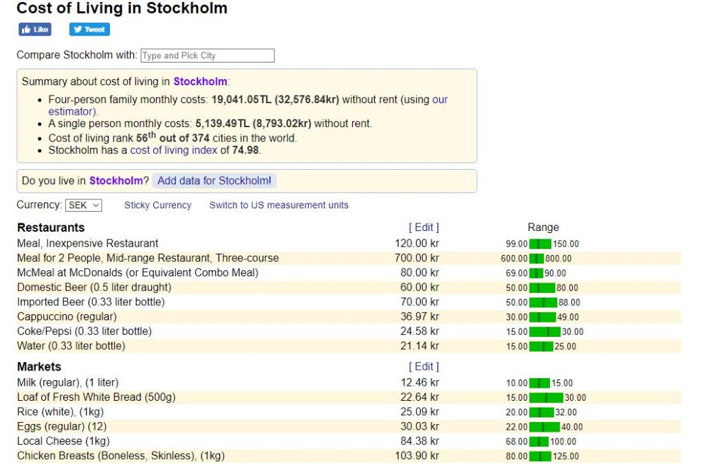 Bir şehrin ortalama maaşlarını, vay efendim kahvesinden market fiyatlarına deterjanından toplu taşımasına heer türlü fiyatı bulabileceğiniz bir site. Şehrin adını girin o size bütün maliyetleri çıkartsın. Siz de ortalama olarak orada ne kadar para harcayacağınızı öğrenmiş oluyorsunuz.