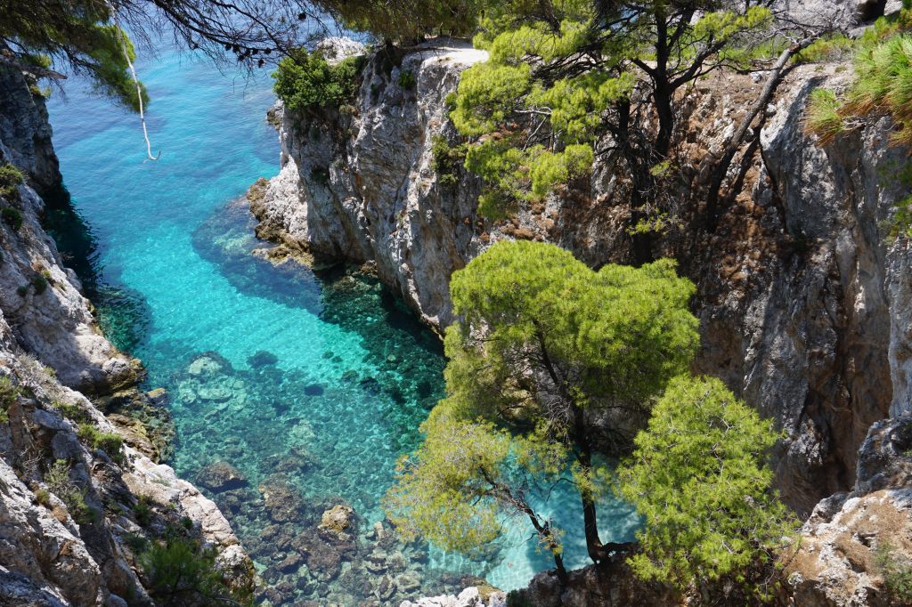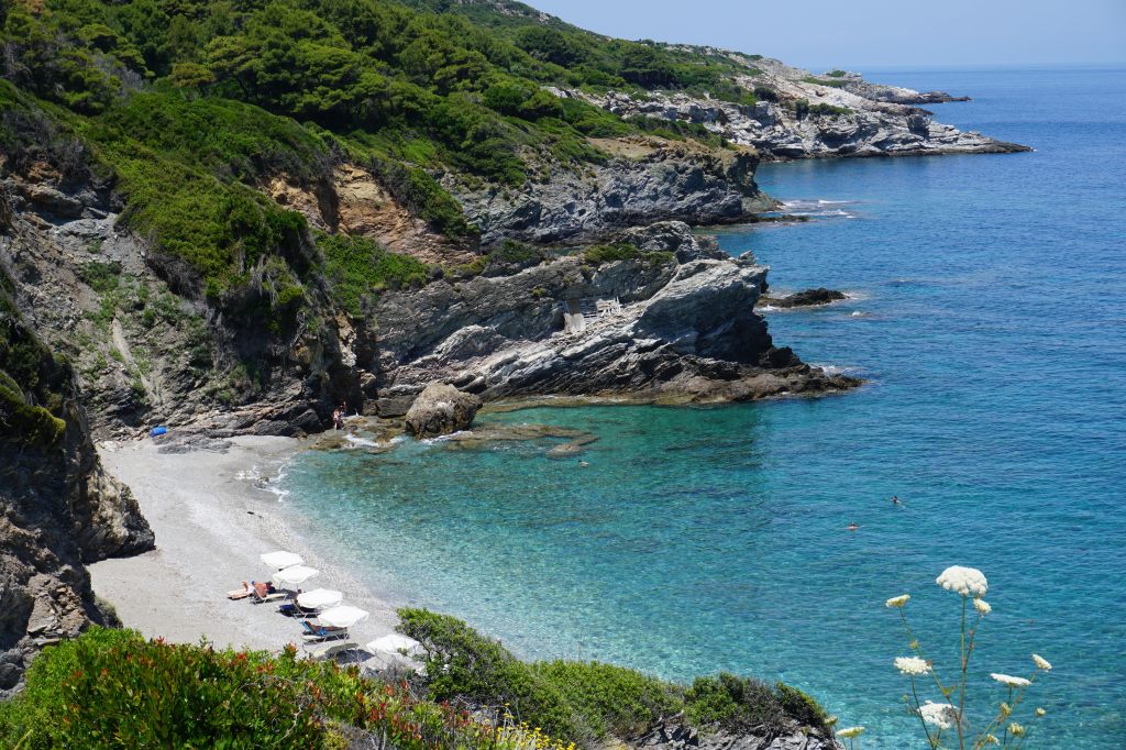 Skopelos’a gitmek istemek için tek başına yeterli bakir bir koy burası. Amarandos Cave, kayalık kıyıları ve kristal berraklığındaki sularıyla tam bir doğa harikası. Buraya ulaştığınızda sizi, turkuaz suların ortasında yükselen üç ünlü çam ağaçlı kaya (Three Trees) karşılıyor. Mamma Mia! filminin bazı sahnelerinin de burada çekildiğini söylemeden geçmeyelim. Buraya tekne turu veya kano ile de gelebilirsiniz, biz araç ile gelip patikadan aşağı indik, kayalıklardan yürümek bir tık zor ama eğer Skopelos’ta deniz keyfi yapmak istiyorsanız, burası kesinlikle kaçırılmaması gereken bir yer.